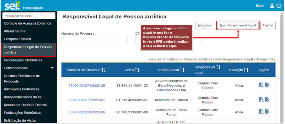 A gestão dos procuradores é feita pelos próprios usuários externos por meio de funcionalidades próprias no SEI. No caso de pessoa jurídica, o primeiro passo para a gestão dos procuradores é a formalização do responsável legal, que é a pessoa física responsável pelo CNPJ na Receita Federal do Brasil. O responsável legal deverá necessariamente possuir cadastro de usuário externo no SEI e poderá cadastrar procuradores especiais, que terão todos os poderes de representação previstos no sistema e poderá, também, emitir procurações eletrônicas simples.