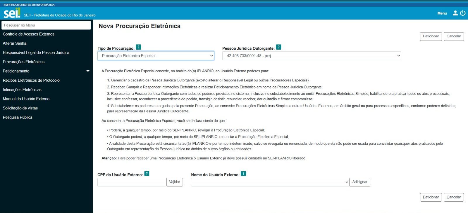 Tela inicial de controle de acessos externosAlterar senhaVinculação com uma pessoa jurídicaProcurações eletrônicas especiais e simplesPeticionamento de processo novo e peticionamento intercorrenteRecibos eletrônicosConsultar e responder uma intimação eletrônicaProcurações eletrônicas especiais e simples