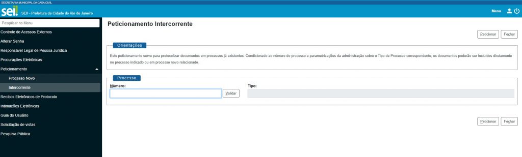 O peticionamento intercorrente tem por finalidade a protocolização de documentos em processos já existentes. Os documentos serão incluídos de forma automática diretamente no processo indicado. Insira o número do processo no qual quer peticionar e clique no botão “Validar”. O sistema somente valida se o número do processo existir.
