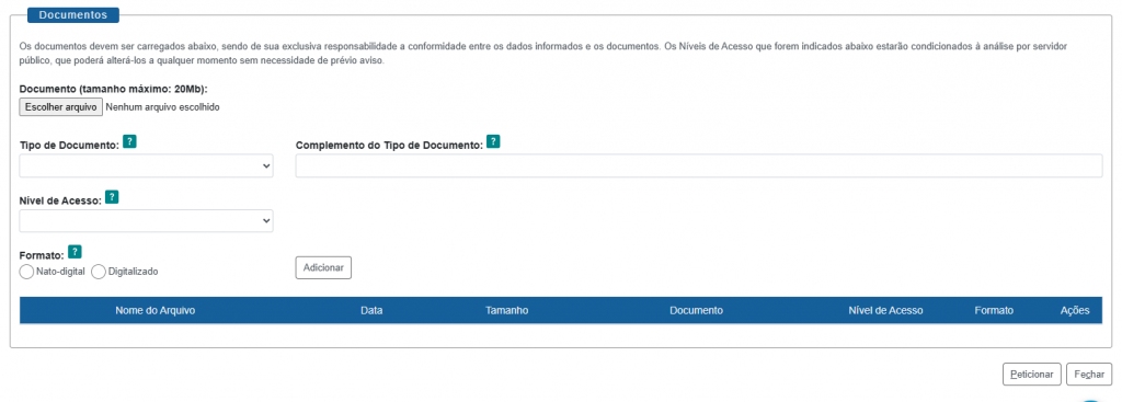 Após adicionar o processo, clique em “Escolher arquivo” na seção “Documentos”, preencha os campos pertinentes e clique em “Adicionar” para cada documento que pretende peticionar. O sistema critica os campos obrigatórios e também as extensões de arquivos permitidas. Ao final, clique em Peticionar.