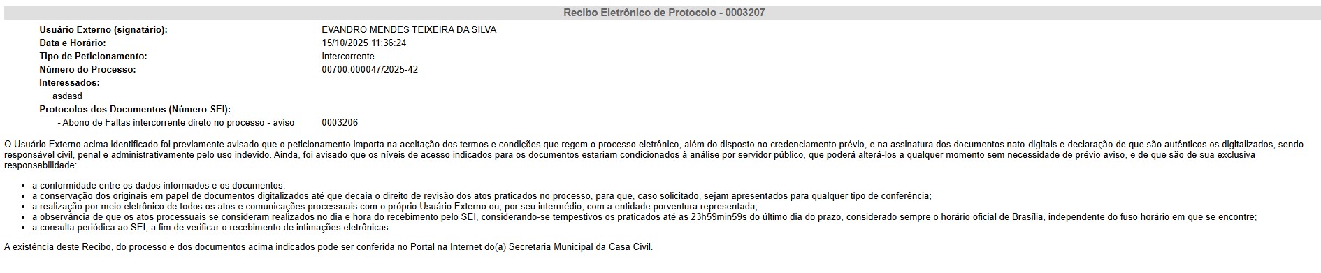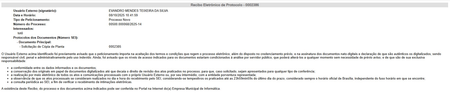 Após a finalização do processamento do peticionamento, o sistema gera o “Recibo Eletrônico de Protocolo” dentro do processo correspondente. O Recibo é a garantia que o peticionamento foi concluído com sucesso. O Sistema só gera o Recibo Eletrônico quando o peticionamento foi finalizado e os arquivos carregados.