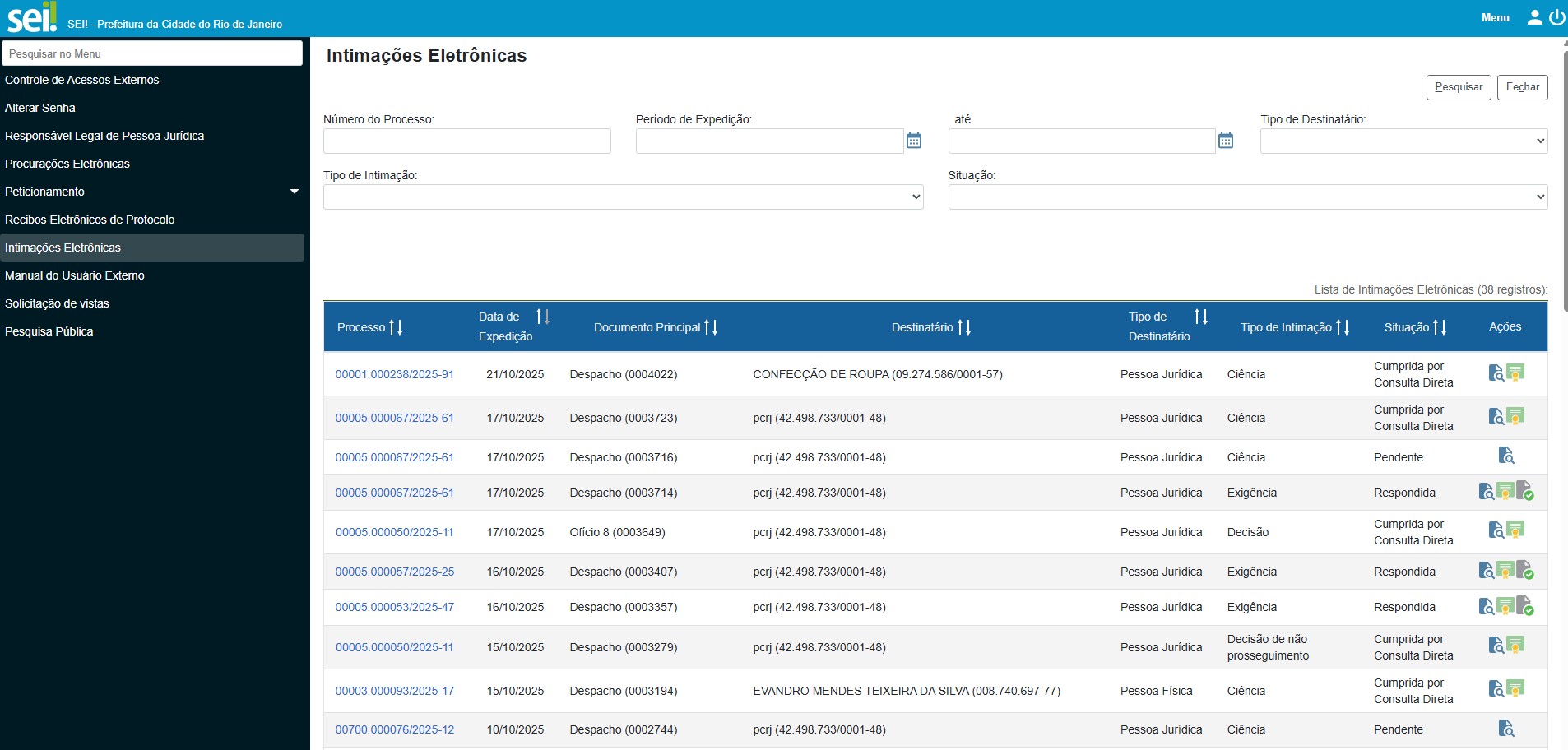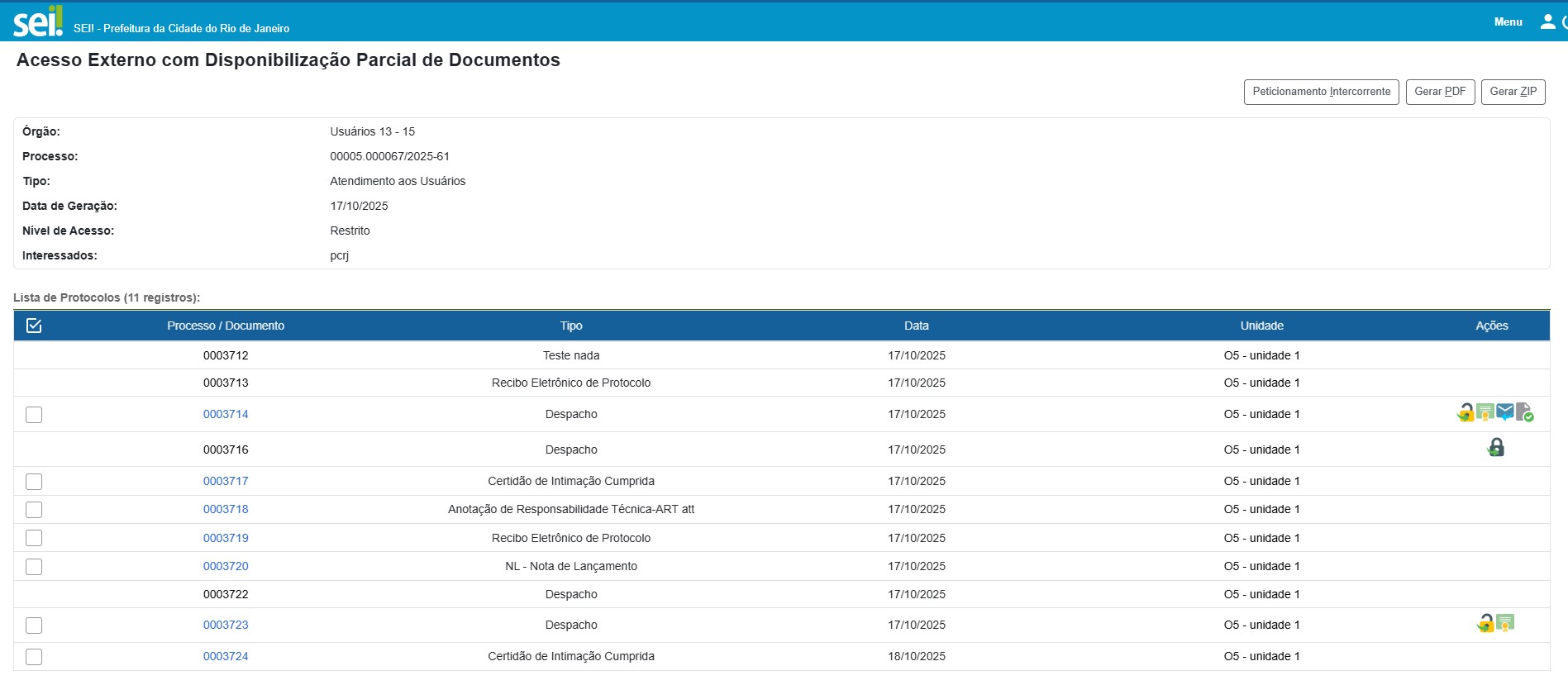 As intimações ficam disponíveis para consulta e resposta na tela de controle de acesso externo no SEI. Abrindo o processo correspondente, o usuário externo pode acessar os documentos já liberados e visualizar ícones de ação na última coluna.