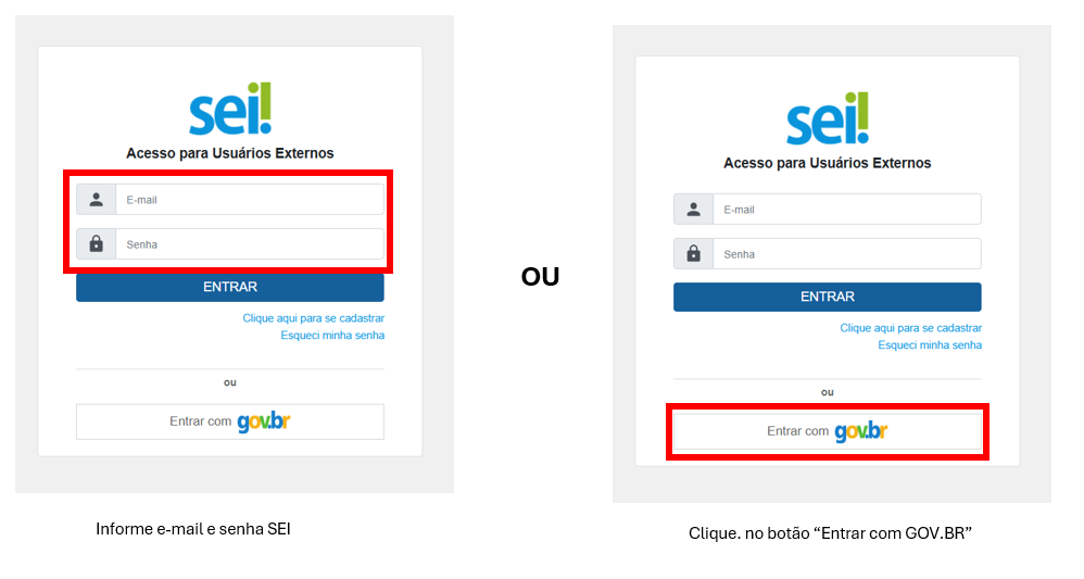 Utilizando o login GOV.BR OU com senha criada no SEI