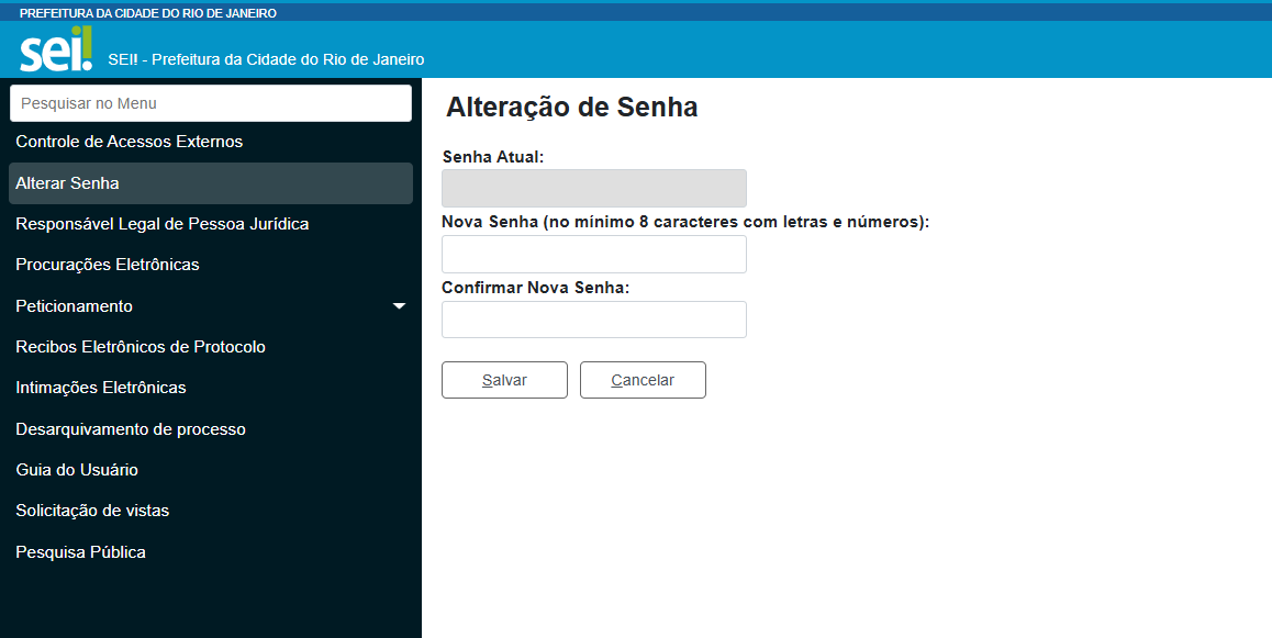Tela inicial de controle de acessos externosAlterar senhaVinculação com uma pessoa jurídicaProcurações eletrônicas especiais e simplesPeticionamento de processo novo e peticionamento intercorrenteRecibos eletrônicosConsultar e responder uma intimação eletrônicaInício > Funcionalidades disponíveis > Alterar senha