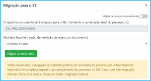 A migração automática pode ser tentada quantas vezes forem necessárias. Enquanto não for concluída com sucesso ou não houver escolha pela migração manual, o status no processo.rio permanece inalterado, e o processo no sei!rio permanece sobrestado.