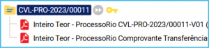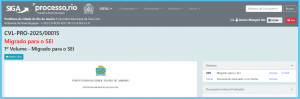 Nos casos de processos ou expedientes volumosos, a migração será particionada em volumes, e a árvore de documentos apresentará para cada volume do processo um documento Inteiro Teor – Processo.rio, seguido do número original – V01, V02, e assim sucessivamente, conforme o número de volumes existentes.
