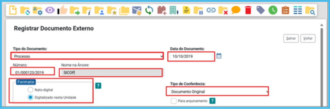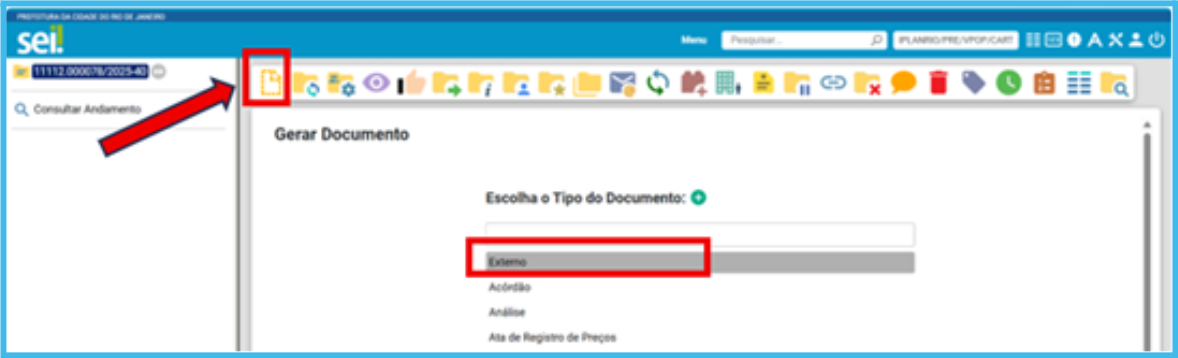 - Na barra de botões, clicar no ícone de inclusão de documentos e selecionar o tipo de documento “externo”.
