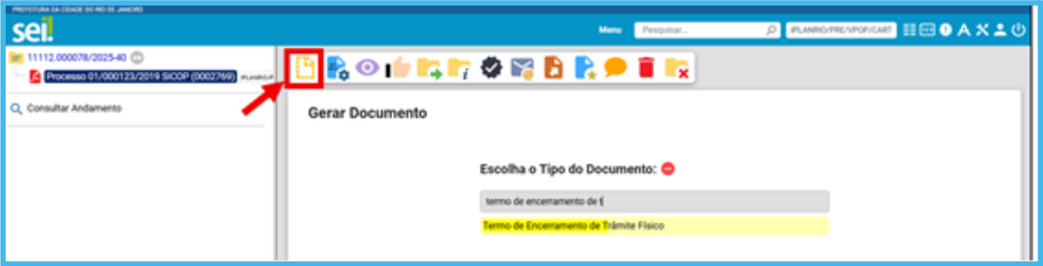 - Clique no ícone de inclusão de documentos na barra de botões e selecione o tipo de documento “Termo de Encerramento de Trâmite em meio físico”;