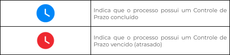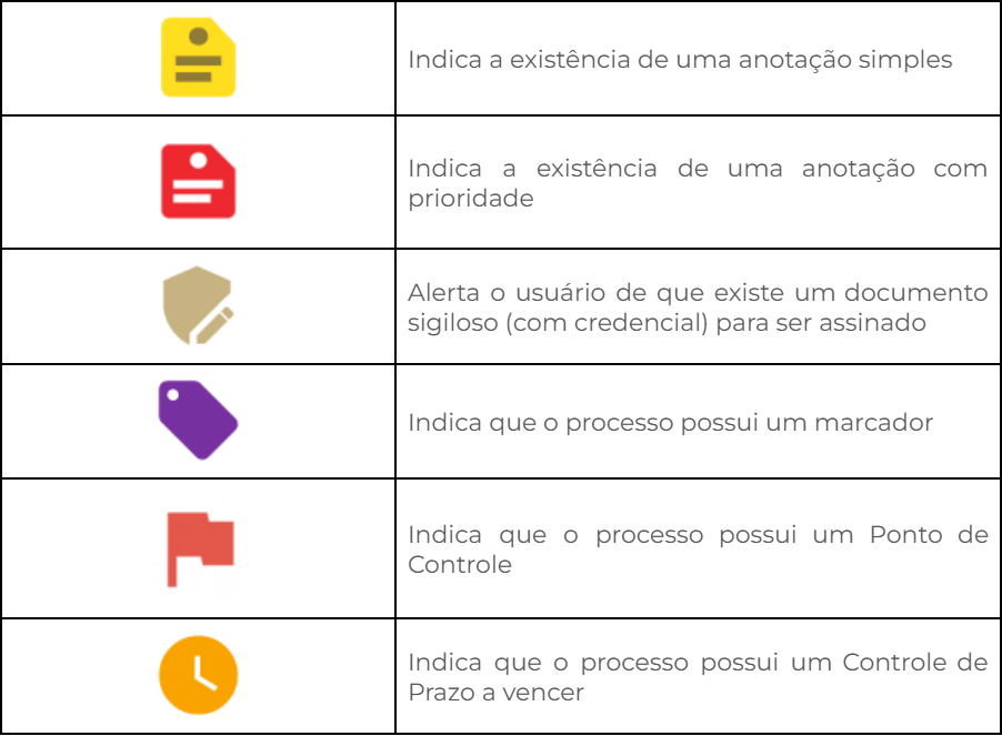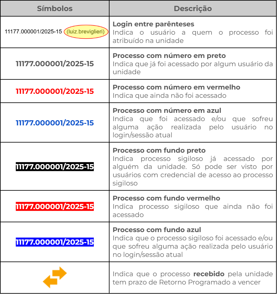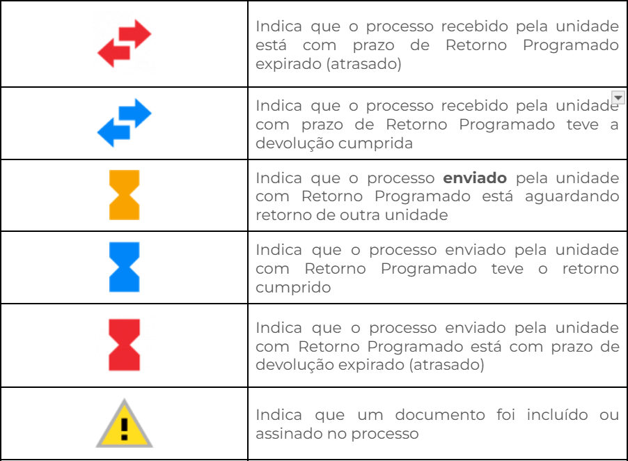 Ao lado de cada processo, símbolos fornecem ao usuário informações visuais da situação do processo dentro da Unidade.