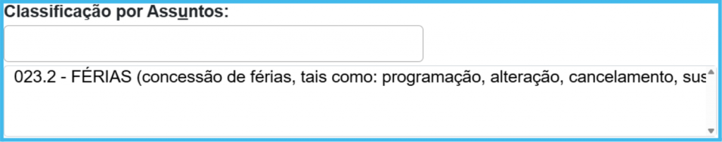 Este campo virá preenchido automaticamente pelo sei!rio a partir do tipo de processo selecionado. Exemplo abaixo de associação para o tipo de processo Gestão de pessoas – solicitação de férias: