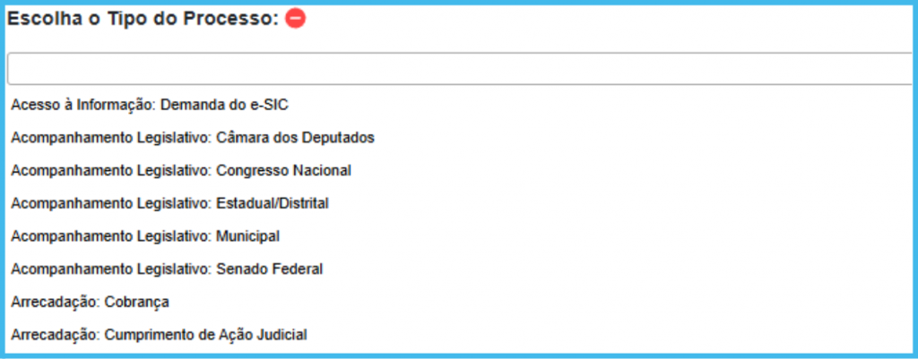 Caso queira buscar um tipo de processo específico, basta digitar uma palavra-chave no campo de pesquisa, e o sistema filtra os resultados conforme o termo inserido.