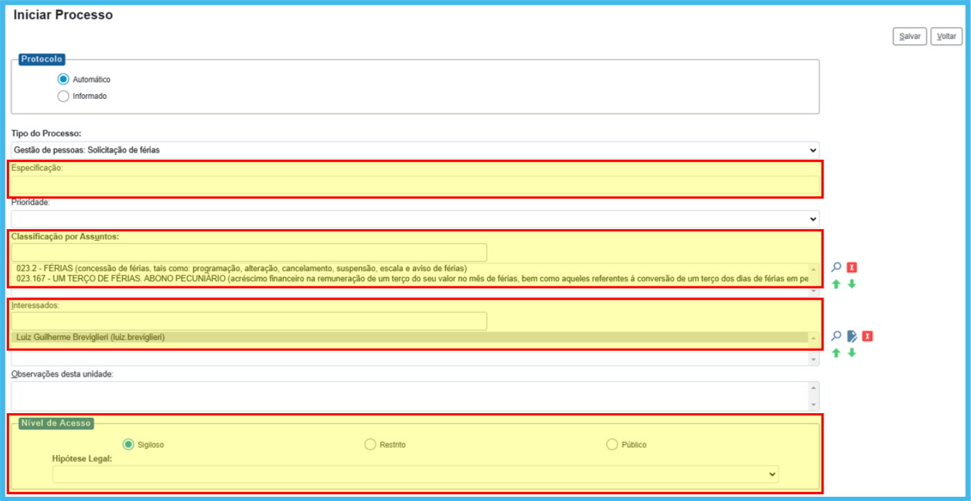 Após a escolha do tipo de processo, o usuário será direcionado para a tela Iniciar Processo para inserir informações complementares: