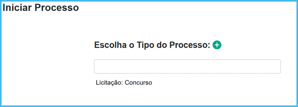 Este campo apresenta a opção escolhida pelo usuário na tela anterior. Caso o usuário identifique a necessidade de substituir por outro tipo de processo, basta clicar no campo e fazer uma nova seleção.