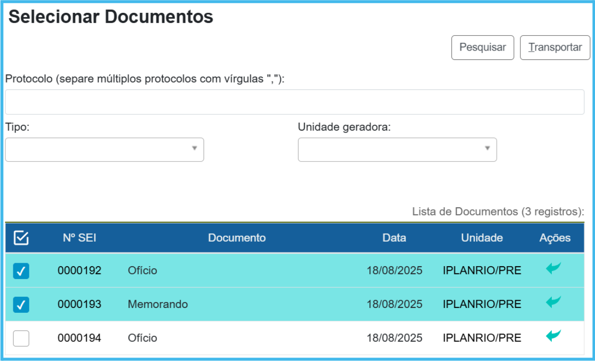 , o usuário poderá escolher o(s) documento(s) que serão enviados. Após selecionar, clique no botão