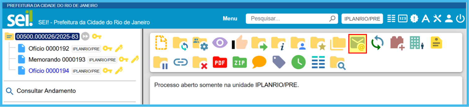 Com o processo desejado aberto na tela do sistema, o usuário deve clicar no botão