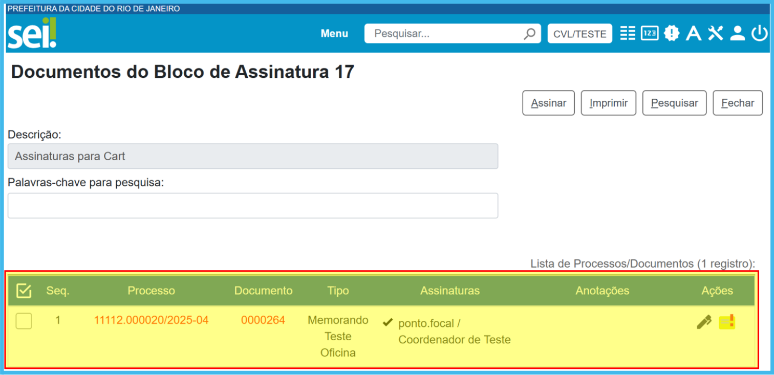 Clicando no número de processo ou do documento, o usuário terá acesso ao documento inserido no bloco e poderá assiná-lo clicando no botão