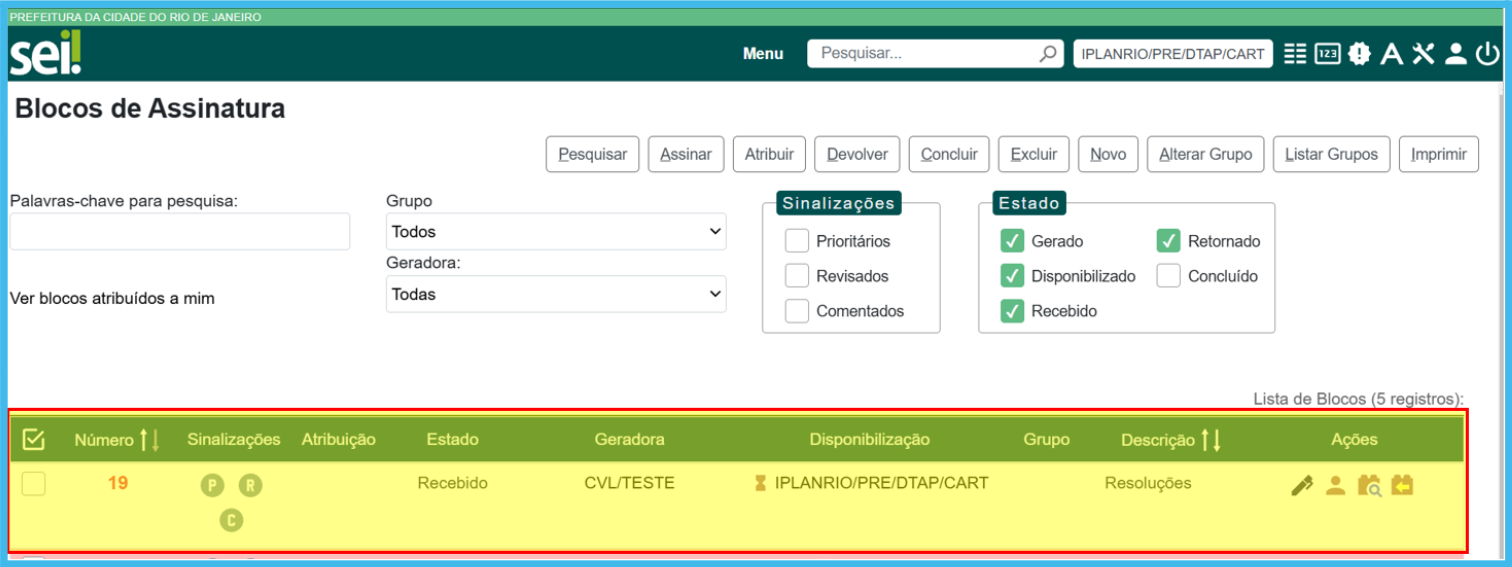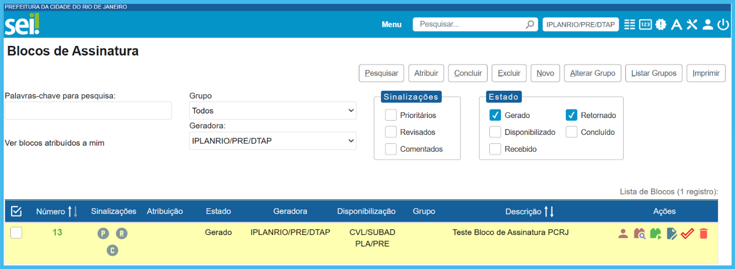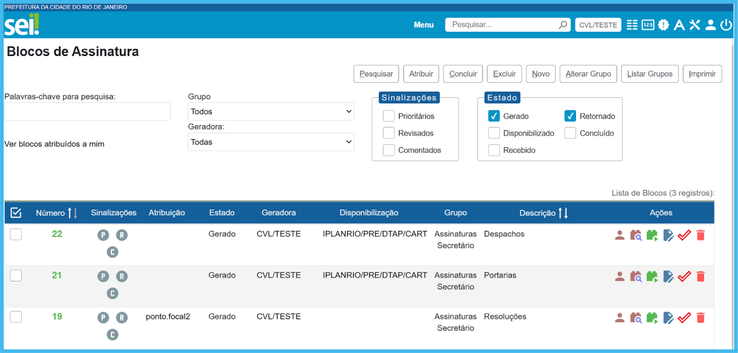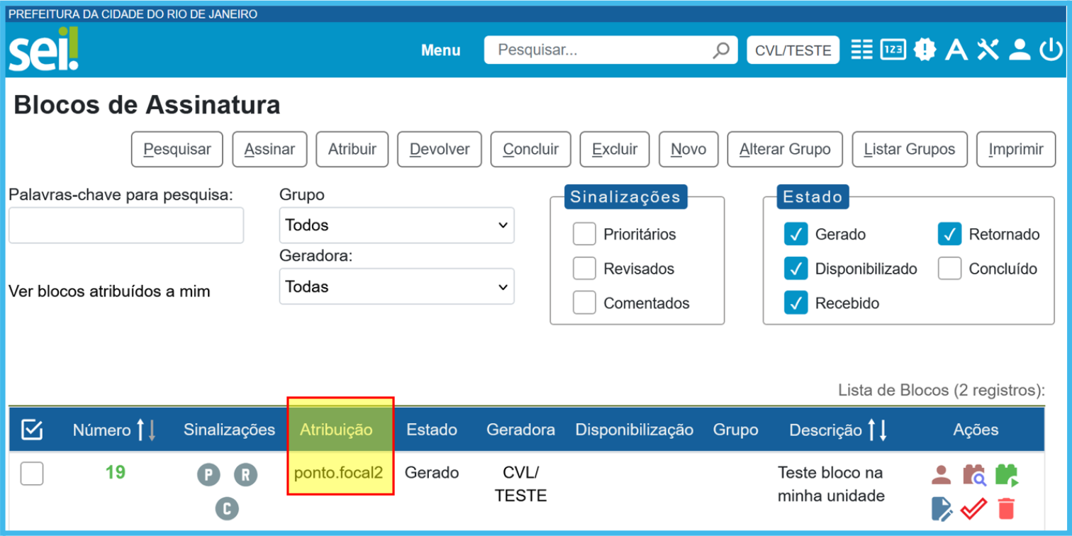 Atribuir Bloco: Esta ação possibilita que o Bloco seja atribuído a um responsável dentro da Unidade.