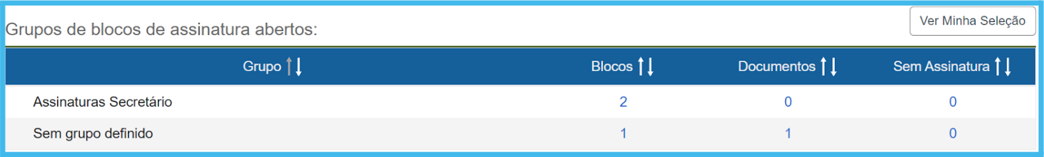 Obs. É possível agrupar blocos por meio da funcionalidade “Grupos de Blocos”, criando uma sinalização comum para conjuntos de blocos relacionados. Por exemplo, a unidade pode criar dois blocos distintos: “Bloco de Resoluções” e “Bloco de Portarias”, e agrupá-los sob um Grupo de Blocos chamado “Assinatura do Secretário”. Essa organização facilita a visualização e o acompanhamento por meio do Painel de Controle, conforme imagem abaixo.
