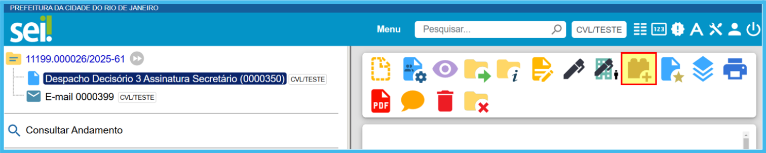 A partir da tela de um Processo aberto: O usuário deverá selecionar, na Árvore de processo, o documento que deseja disponibilizar para assinatura(s) de terceiros e clicar no botão