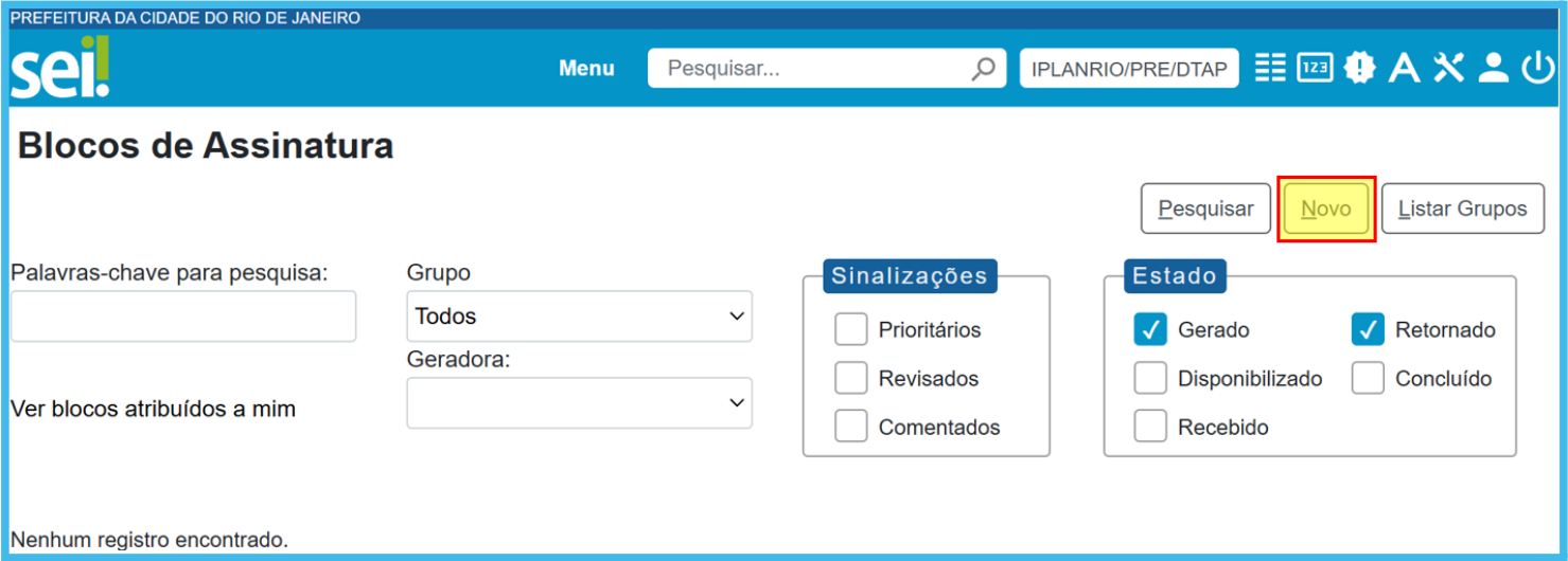 Para criar um Bloco de Assinatura, o usuário deve acessar o menu principal, clicar em Blocos, e em Assinatura. Na tela Blocos de Assinatura, clicar em Novo.