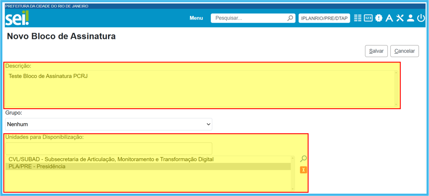 Inclua uma descrição para facilitar a identificação do assunto tratado no Bloco de Assinatura, indique a(s) Unidade(s) que irá(ão) receber o Bloco e clique em