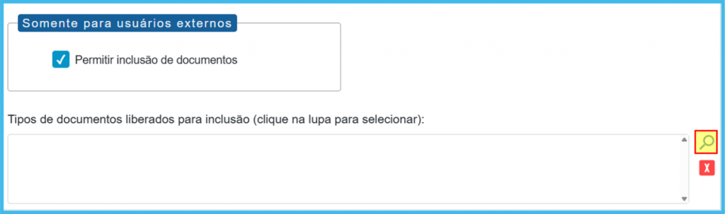 Disponibiliza a possibilidade do destinatário incluir documentos no processo. Selecionando essa opção, será necessário que o usuário interno informe o(s) tipo(s) de documento(s) que poderá ser incluído, conforme imagem abaixo.