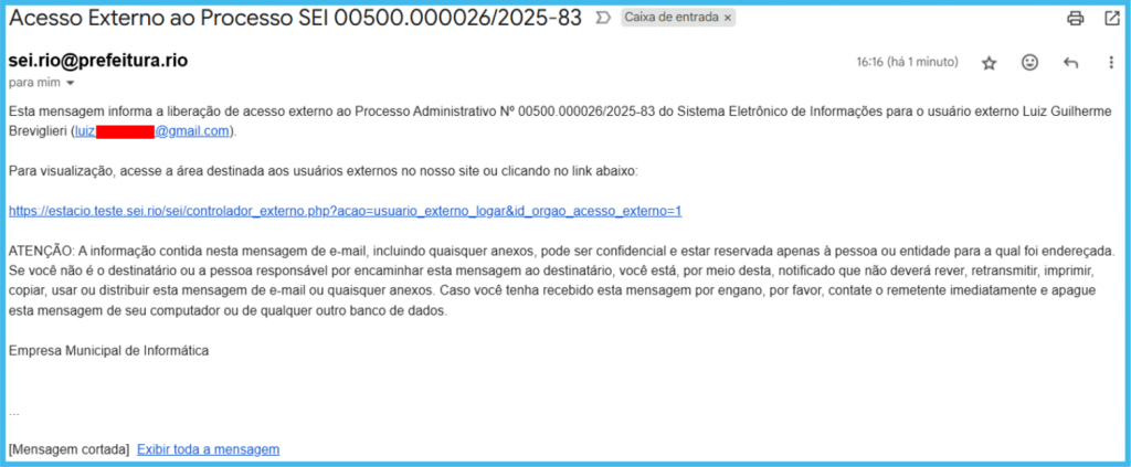 Imagem do e-mail enviado pelo sistema, informando a disponibilização de acesso ao processo.