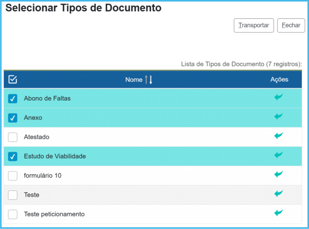 A janela ‘Selecionar Tipos de Documento’ é apresentada. Escolher o(s) tipo(s) de documento(s) e clicar no botão
