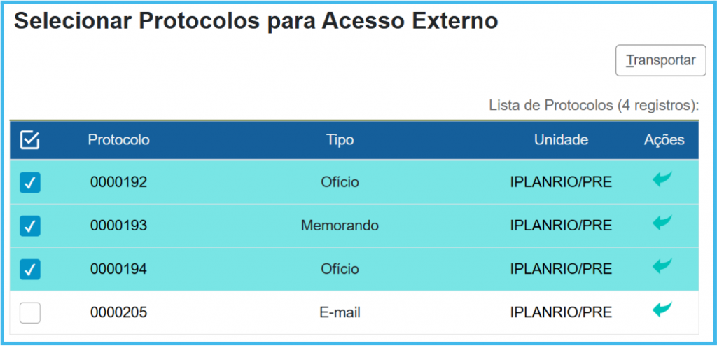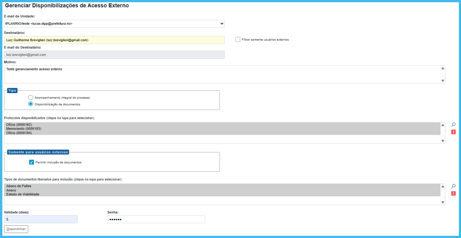 . Feche a tela “Selecionar Protocolos para Acesso Externo”. Os documentos selecionados aparecem na tela de disponibilização.
