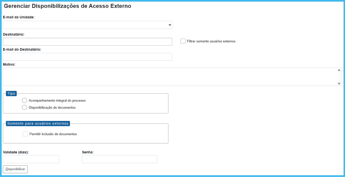 Tipo (de Acesso) – Define a abrangência do acesso que será concedido ao usuário externo. O usuário deverá escolher uma das duas opções: