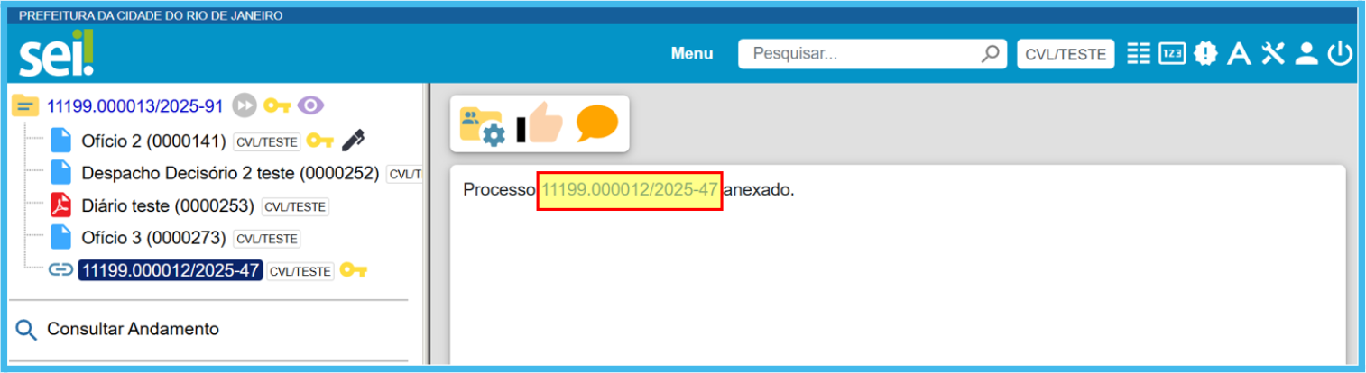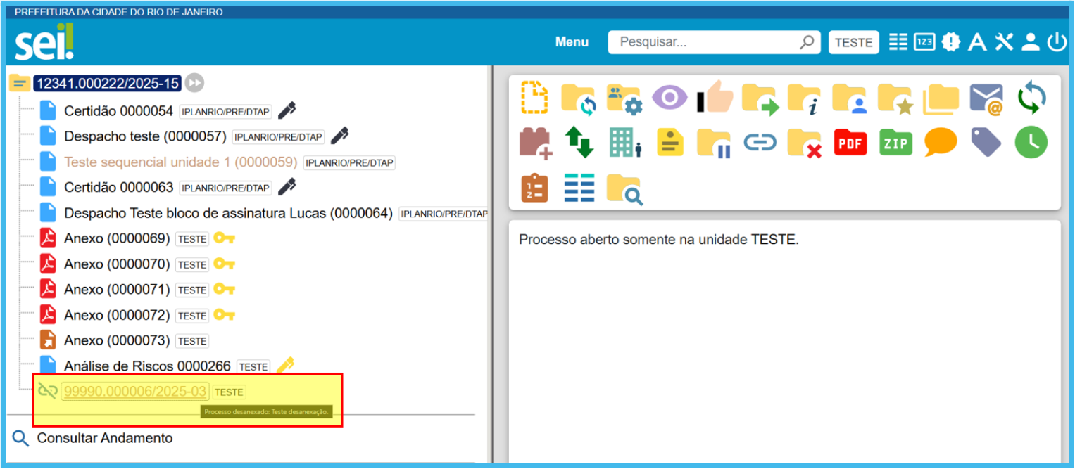Mesmo após a desanexação, a indicação de que o processo acessório integrou o processo principal em algum momento permanece visível na Árvore do Processo. No entanto, ele se torna inacessível aos usuários que têm acesso apenas ao processo principal.