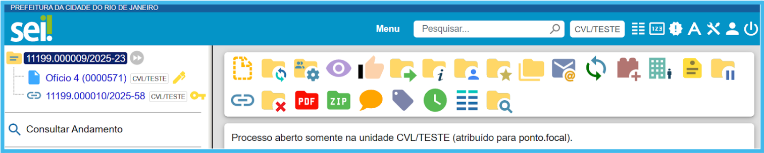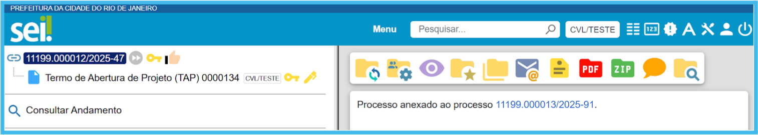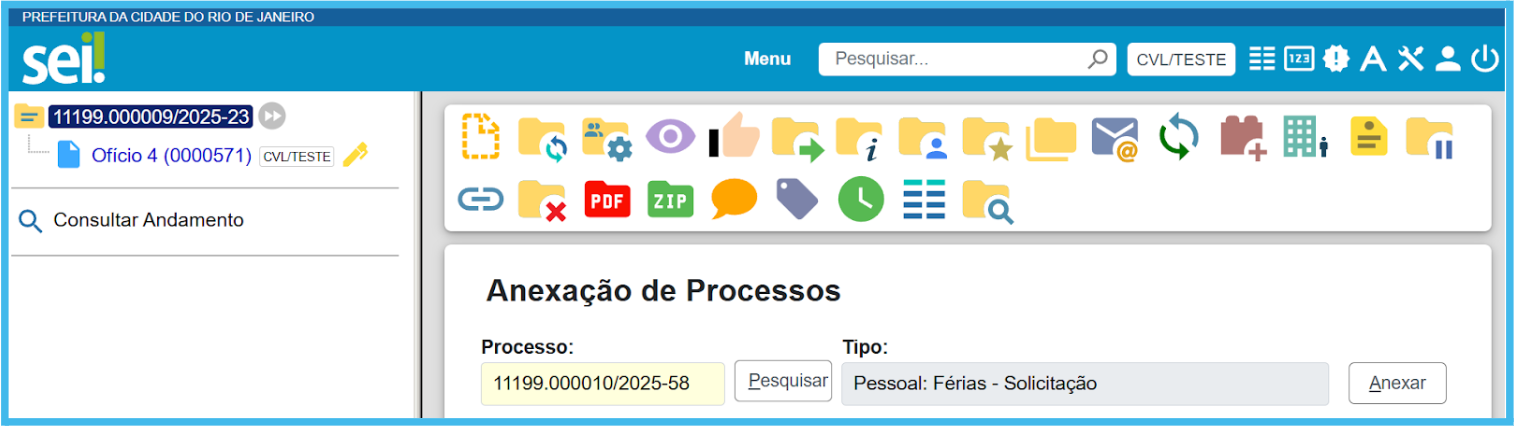 Abra o processo principal ao qual deseja anexar o processo acessório. Clique no botão de anexação
