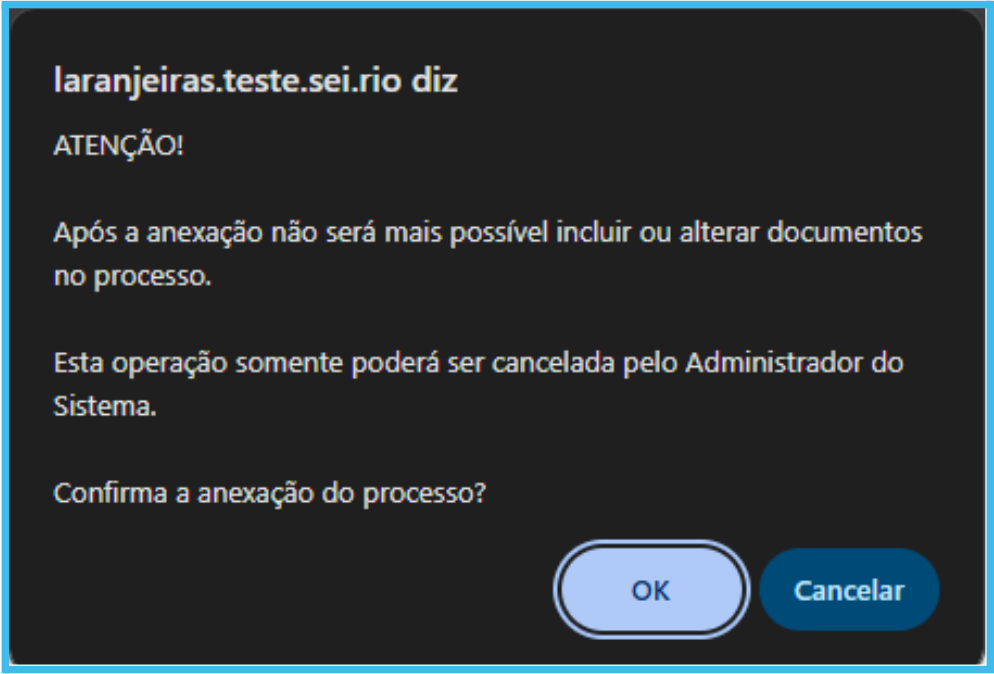 . O sistema apresentará o pop-up abaixo, alertando sobre a ação de anexação de processos.