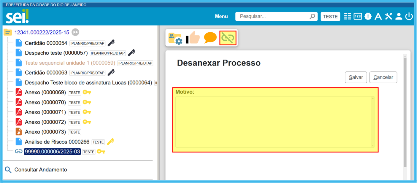 A informação de que o processo foi desanexado e o motivo informado pelo usuário serão apresentados, conforme tela abaixo.