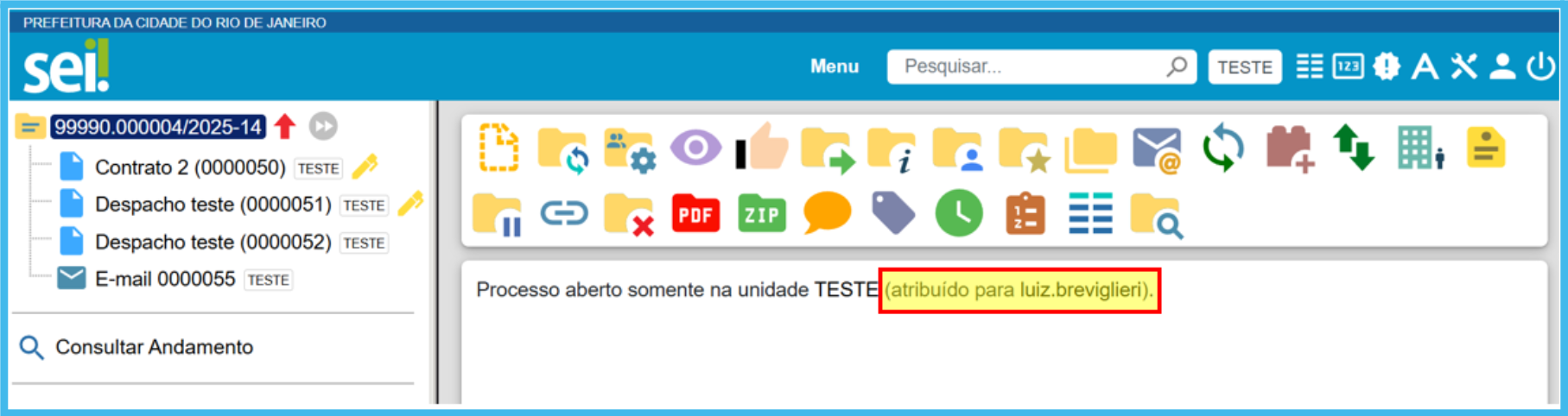 A funcionalidade de Atribuição também pode ser utilizada com o processo aberto na tela do sistema. Nesse caso, a informação é exibida conforme demonstrado na imagem abaixo.
