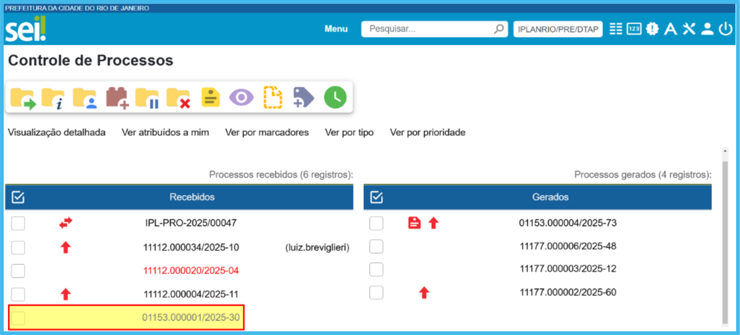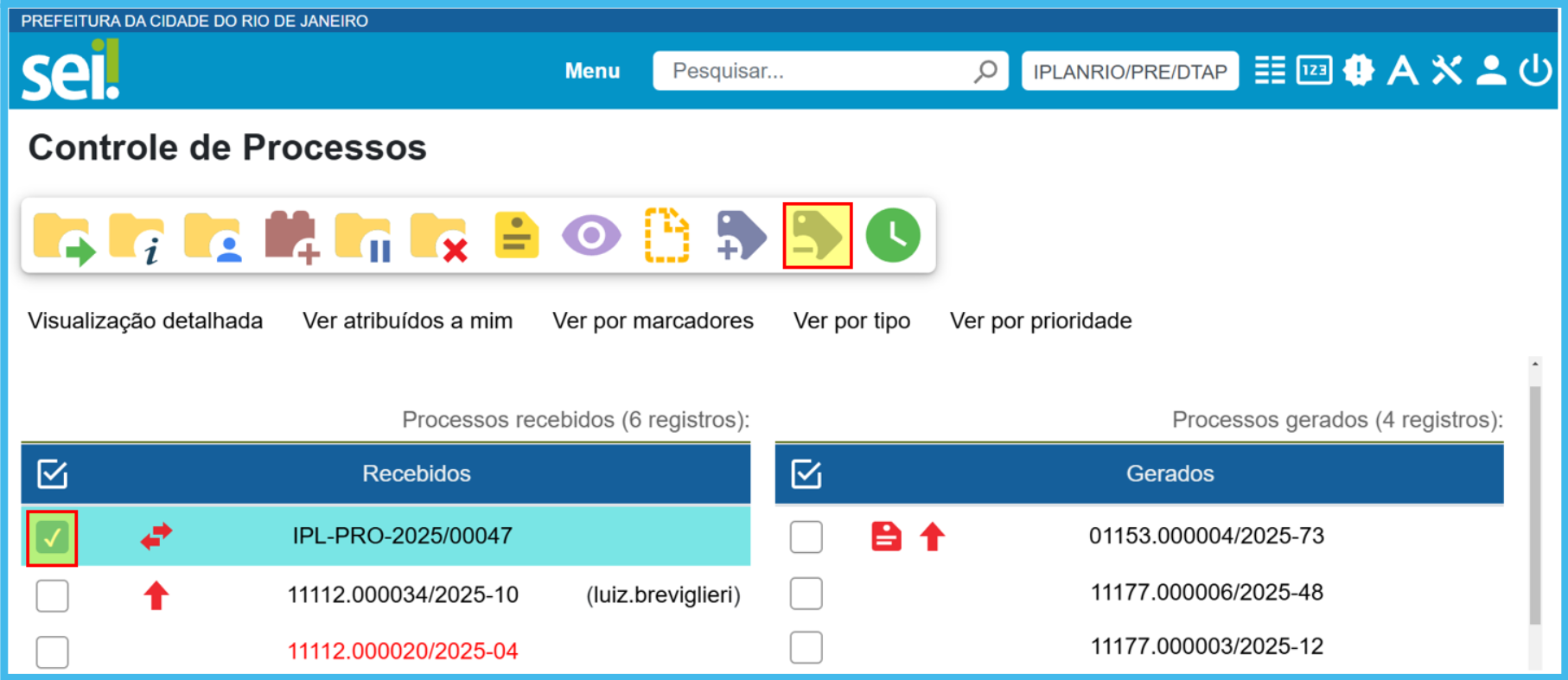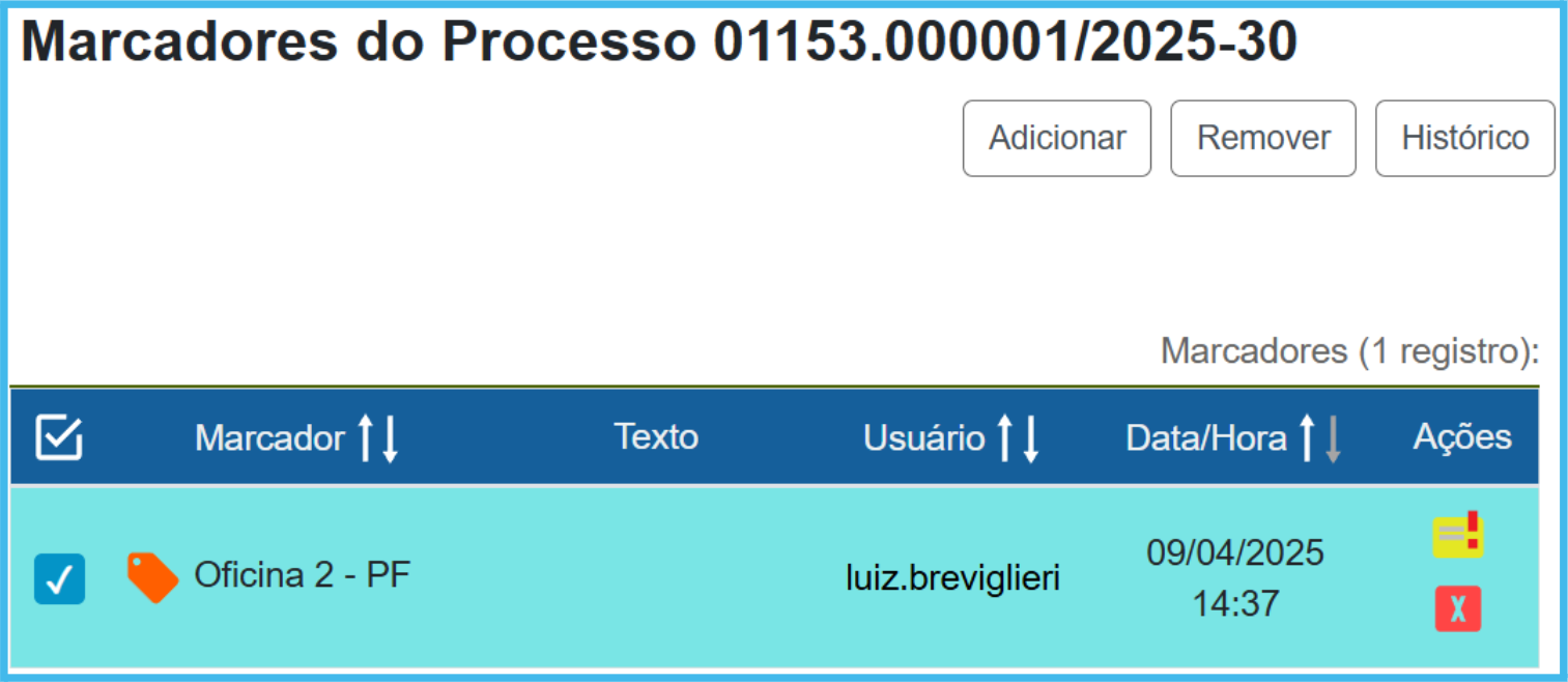 Na tela do processos aberto, selecione o(s) processo(s) e clique no ícone Gerenciar Marcador