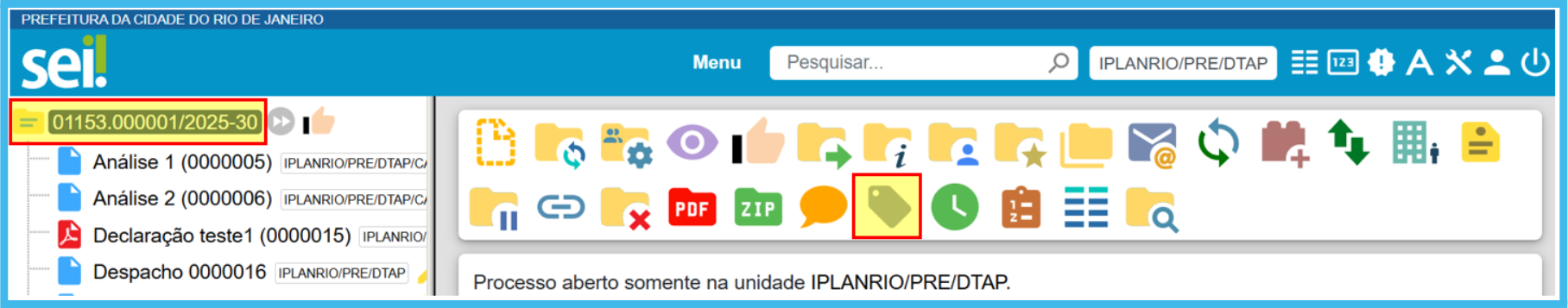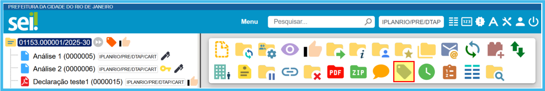 Na tela do processo aberto, clique no ícone Gerenciar Marcador, disponível na Barra de Ícones.