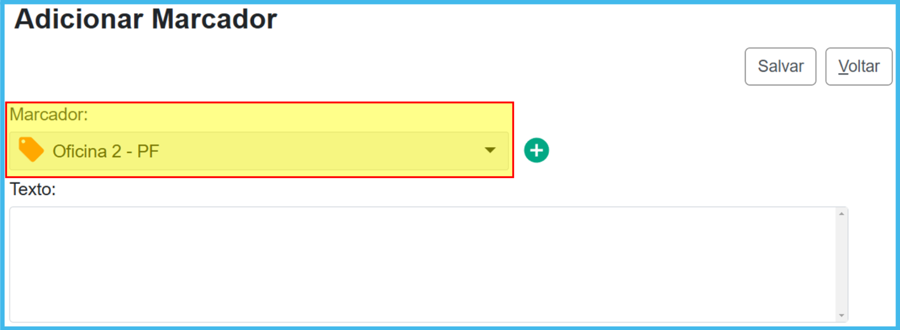 Depois de efetuar uma das opções descritas acima, será aberta a tela Adicionar Marcador. Nessa tela, o usuário poderá selecionar um marcador já existente, na caixa Marcador; ou criar um marcador clicando no ícone Novo Marcador