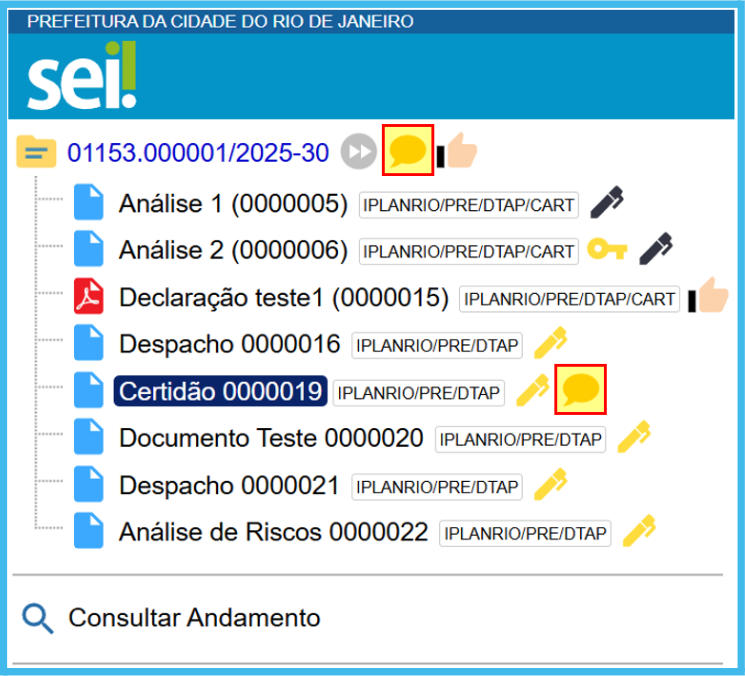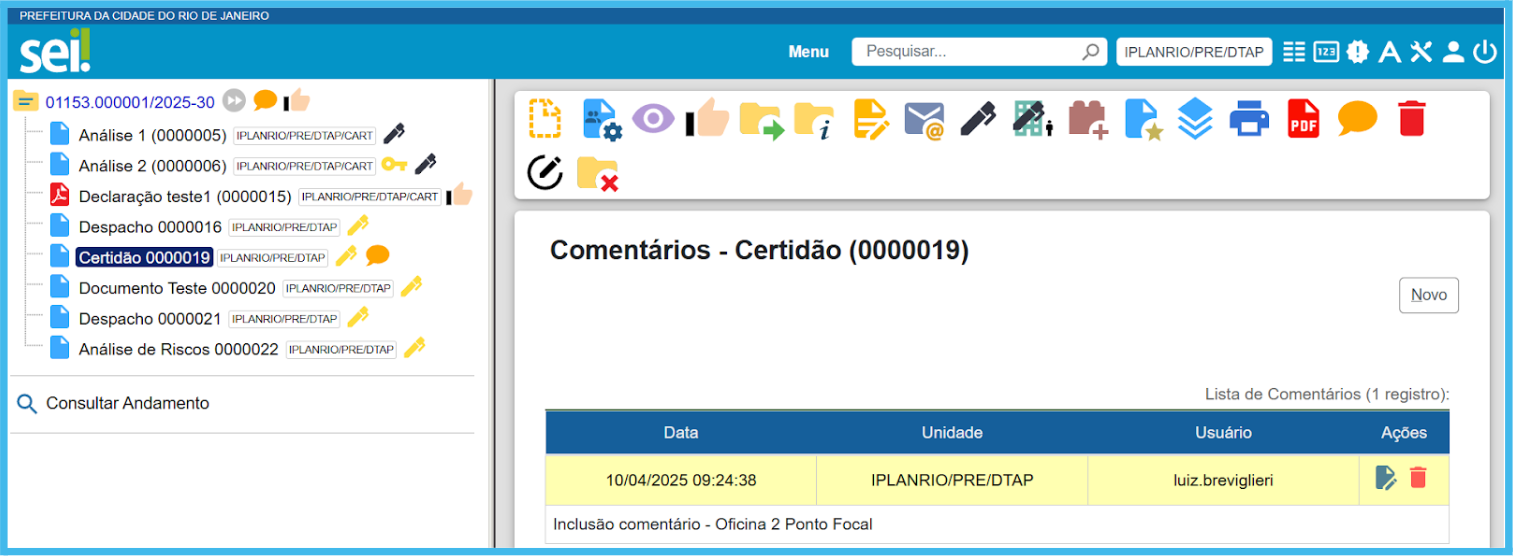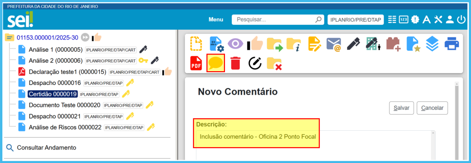 É possível a inclusão de vários comentários tanto no processo quanto no(s) documento(s).