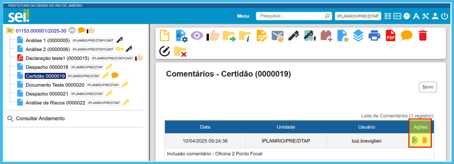 Para alterar ou excluir um comentário em um processo ou documento, clique no ícone