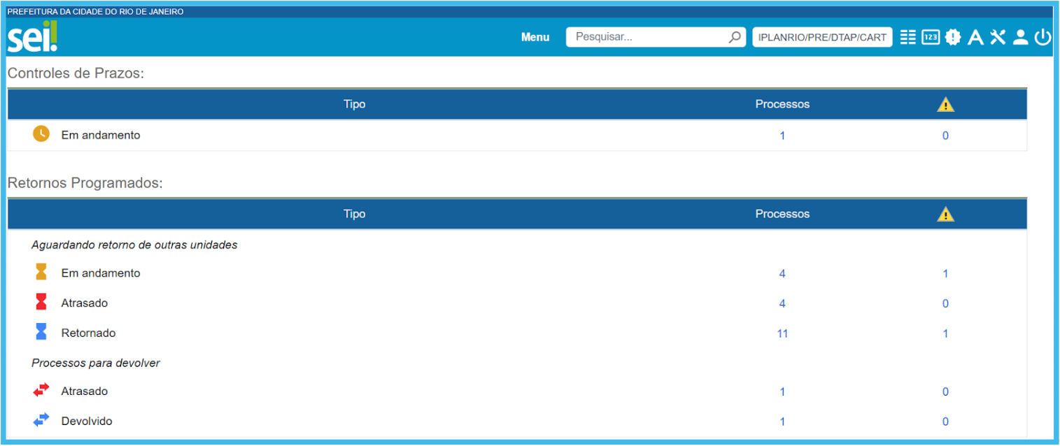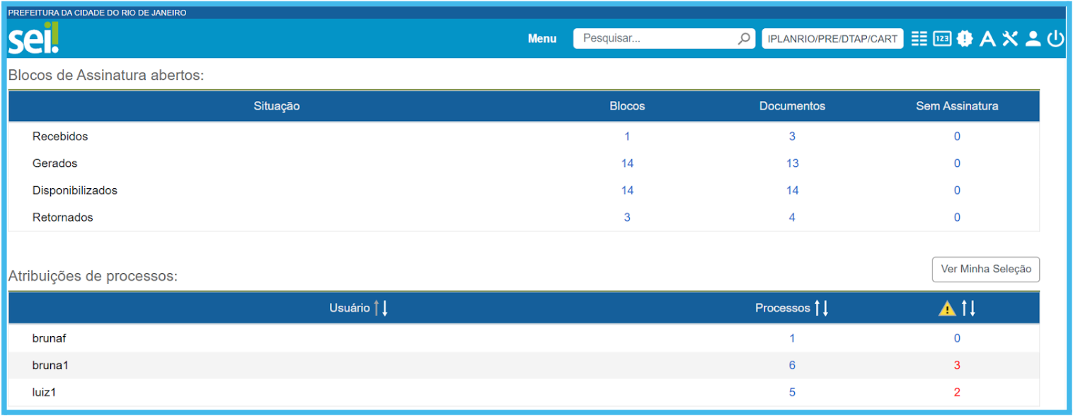 Além das seções, são apresentados outros indicadores, como Controle de Prazos, Retornos Programados, Blocos de Assinatura abertos e Atribuições de processos, conforme imagens abaixo.