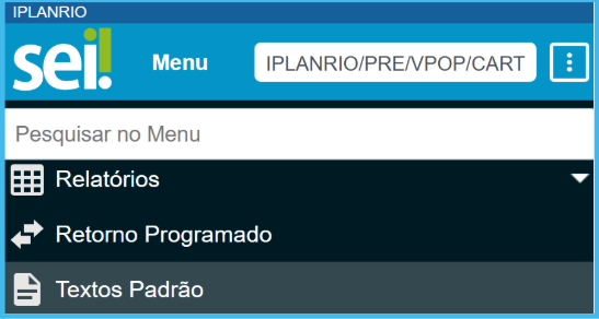 O sei!rio permite que um texto de uso recorrente na unidade possa ser salvo e utilizado como padrão para documentos produzidos no sistema. Esses textos padrão são criados pelos usuários das unidades, de acordo com as suas necessidades. Para criar um Texto padrão, selecione a opção Textos Padrão, que se encontra disponível no Menu Principal.