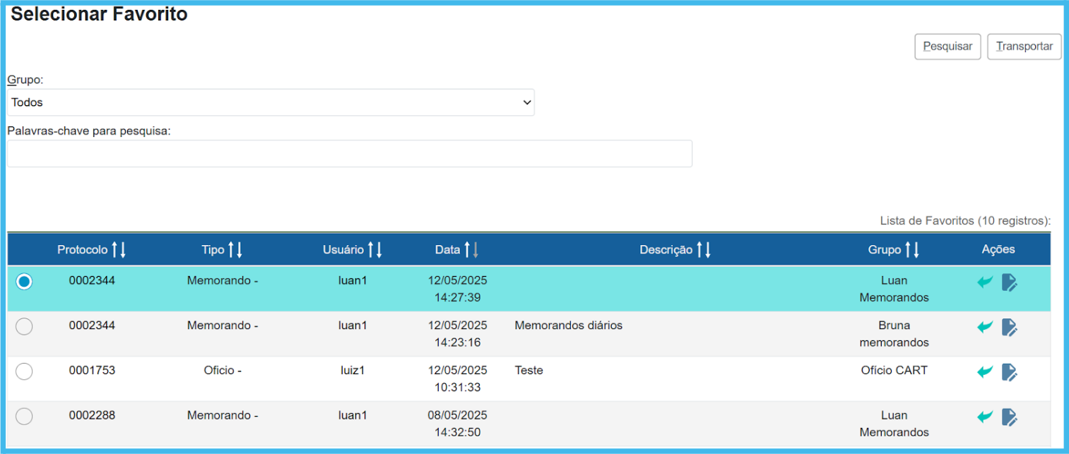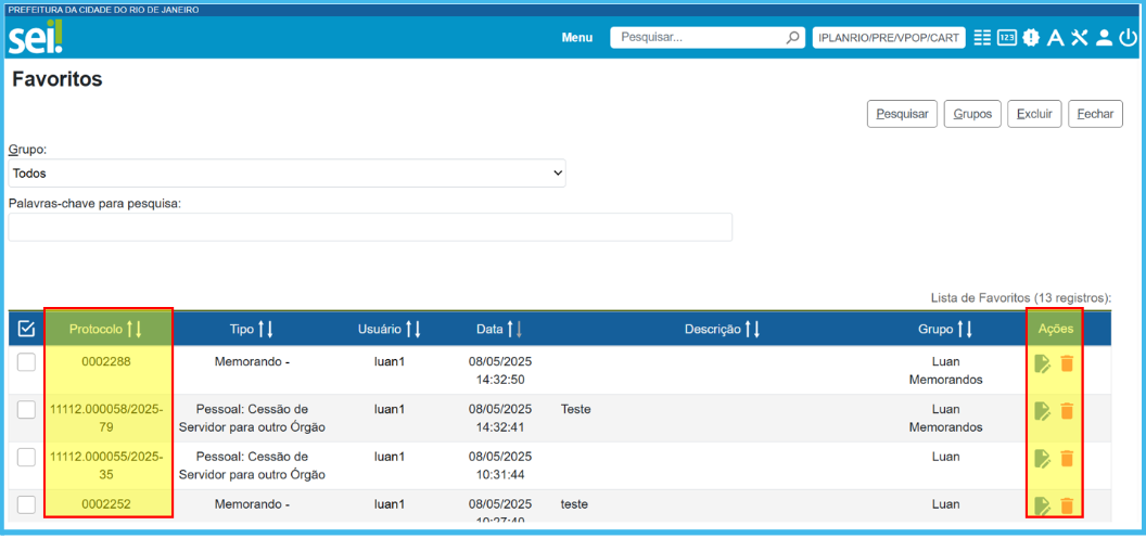 Na coluna Protocolo são apresentados os documentos (0002288) e processos (11112.000058/2025-79) que foram incluídos como favoritos na unidade. Na coluna Ações, o usuário tem a possibilidade de alterar