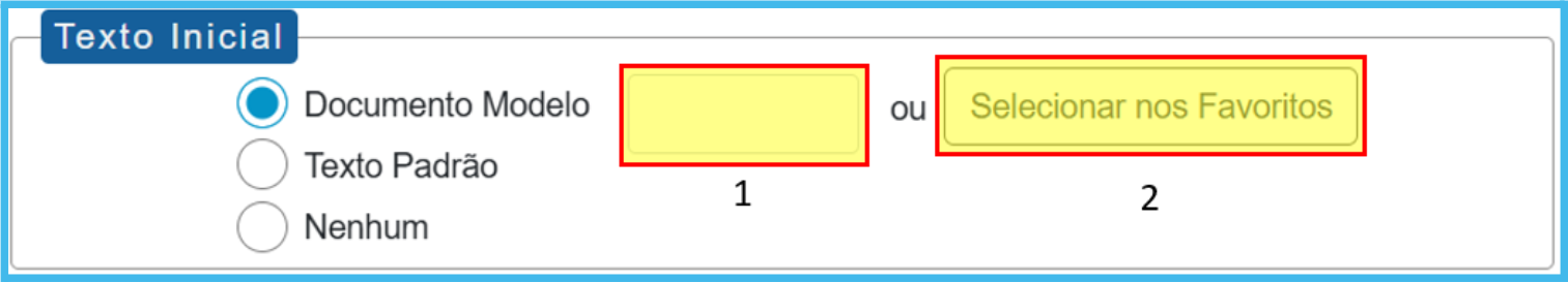 No campo “1” o usuário pode inserir diretamente o número SEI do documento que deseja utilizar, caso saiba. No campo “2” o usuário poderá escolher o documento adicionado como favorito na unidade, conforme imagem abaixo.