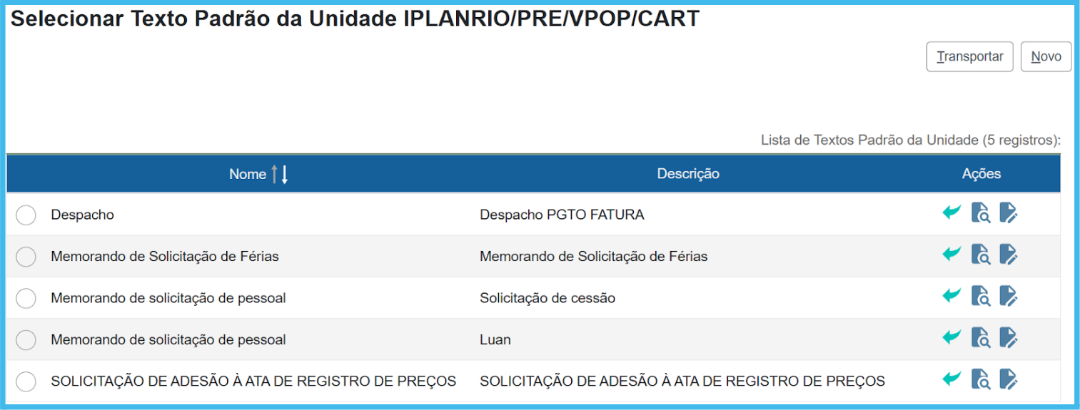 que possibilita ao usuário visualizar o conteúdo do texto padrão salvo e o botão