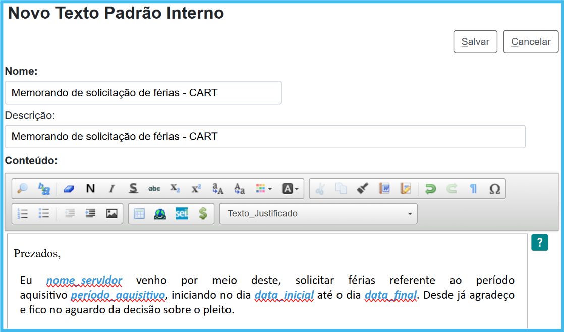 Preencha os campos Nome e Descrição e no campo Conteúdo, insira o texto desejado, conforme tela abaixo, e clique no botão