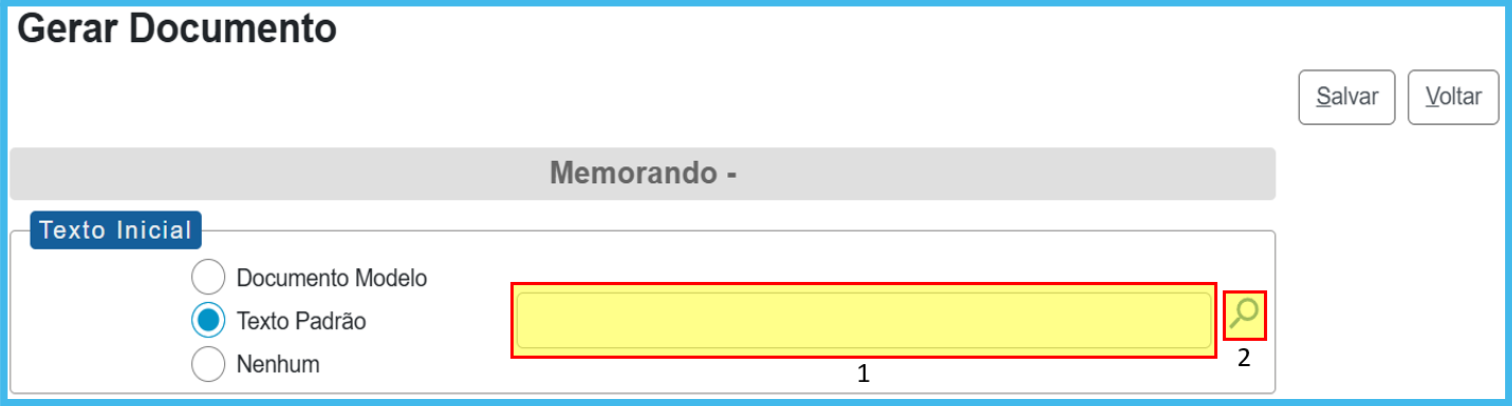 , e na tela seguinte, escolha o tipo de documento que deseja incluir no processo. Na tela de Gerar Documento selecione a opção Texto Padrão, e digite o nome do texto padrão salvo.