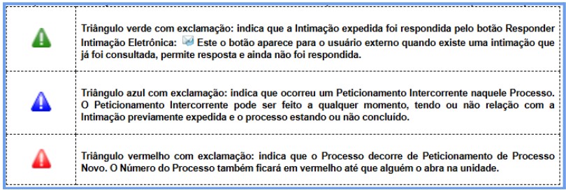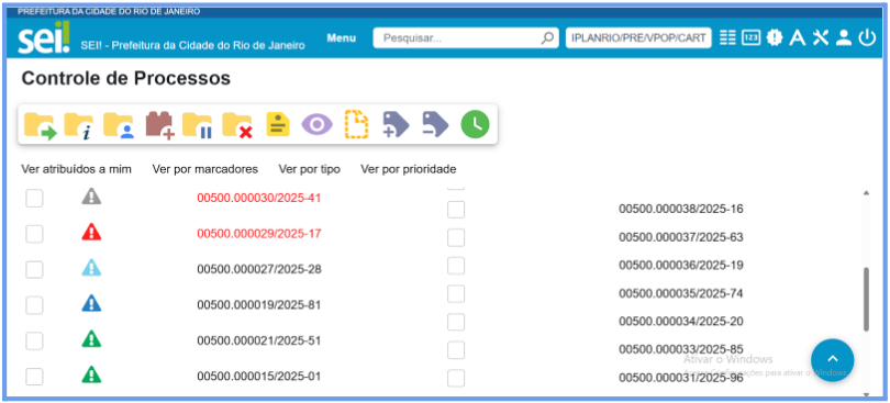 Para identificar se um processo foi iniciado por meio do Peticionamento Eletrônico, verifique na tela de Controle de Processos o símbolo de um “triângulo” VERMELHO, conforme tela abaixo: