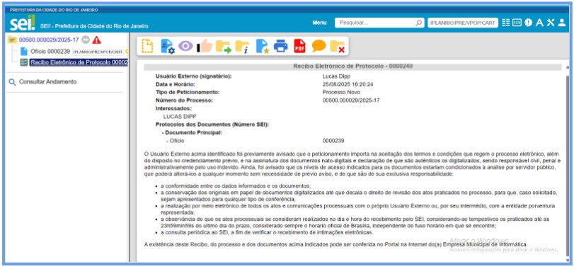 Sempre que um peticionamento é criado, o SEI gera um Recibo Eletrônico de Protocolo, comprovando que o peticionamento foi concluído com êxito e assegurando a sua validade. É uma garantia para os usuários, um registro de que o SEI recebeu e processou devidamente os documentos apresentados.