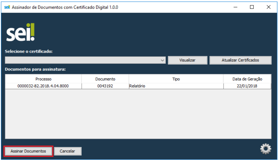 Certifique-se que seu certificado digital está selecionado no primeiro campo da tela acima. Após a exibição dos documentos, assine por meio do botão “Assinar Documentos”.
